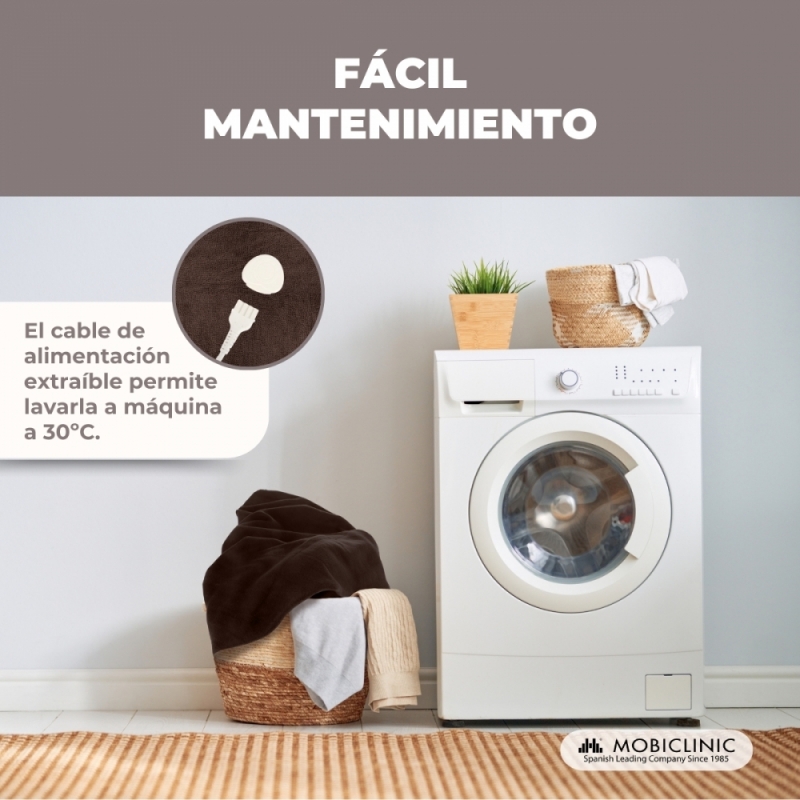Manta de tejido resistente fabricada con tela no tejida (poliéster) con fabricación de soldadura por estampación . El cable de alimentación extraíble permite lavarla a máquina a 30º. Se fija fácilmente al colchón mediante cordones elásticos