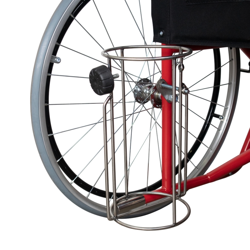 Asimismo, el porta oxígeno, es un accesorio que permite al usuario colocar el oxígeno en la parte trasera de la silla de ruedas. Su material es de acero cromado contando con un diámetro interior de 15 cm.