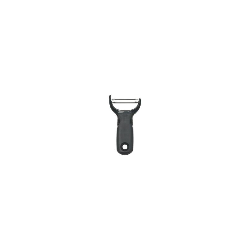 Pelador de verduras y frutas con mango grueso de material sintético en forma de "Y" y cuchilla dispuesta horizontalmente de acero inoxidable. Una práctica herramienta que agilizará la preparación de la comida y puede ser utilizada por todos los adultos de la familia.