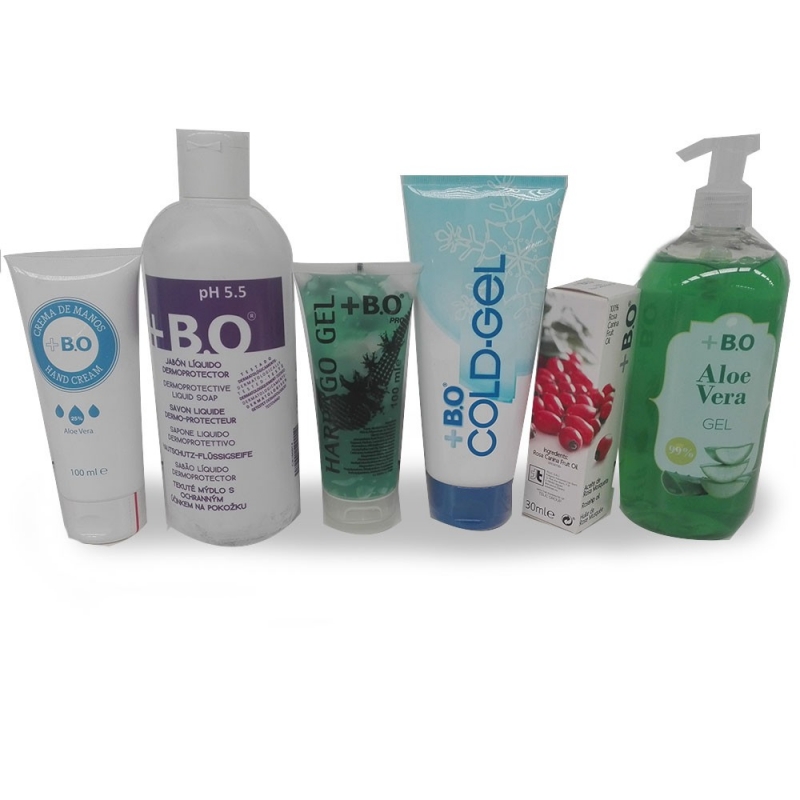 El pack contiene: +B.O harpagogel 100 ml +B.O crema de manos tubo 100ml +B.O gel frio 100 ml +B.O jabon botella 500 ml +B.O aceite rosa mosqueta 30 ml +B.O gel Aloe Vera 500 ml +dispensador