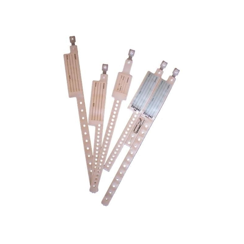 Brazalete fabricado en plástico, material PVC suave. El cierre utilizado es de tipo botón, totalmente inviolable. Seguridad: el sistema de cierre utilizado es totalmente inviolable, y forzando su apertura quedaría el cierre roto evitando su reutilización. Incluye etiquetas.
