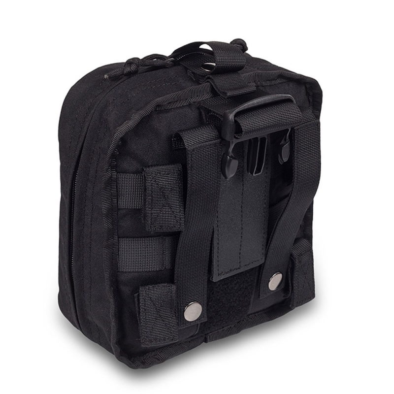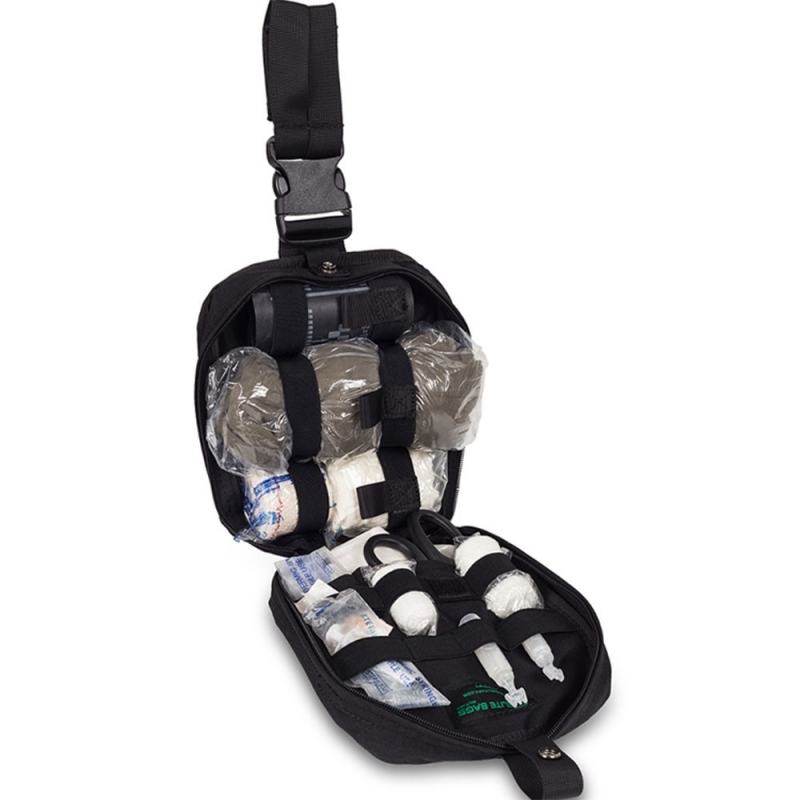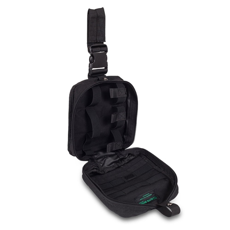 IFAK Botiquín hemostático individual Desarrollado especialmente para atender cualquier tipo de urgencia de tipo Hemostático-traumático. El nuevo botiquín diseñado por EB Military permite alojar de forma organizada todo el material norma-lizado para emergencia individual y facilita la extracción de cualquiera de los múltiples materiales alojados en su interior. Cuenta con un sistema de sujeción al ceñidor mediante dos cintas de velcro y hebilla de desenganche rápido además de dos bandas elásticas horizontales que facilitarán su enganche a la pierna, garantizando una ubicación y fijación firmes, evitando movimientos indeseados. Cuenta además con sistema MOLLE trasero, que nos permitirá anclarlo a cualquier elemento que el combatiente posea (mochila, peco, chaleco antibalas, cinturón, etc) y un bolsillo frontal externo, con cierre de velcro, para portar pequeños artículos.