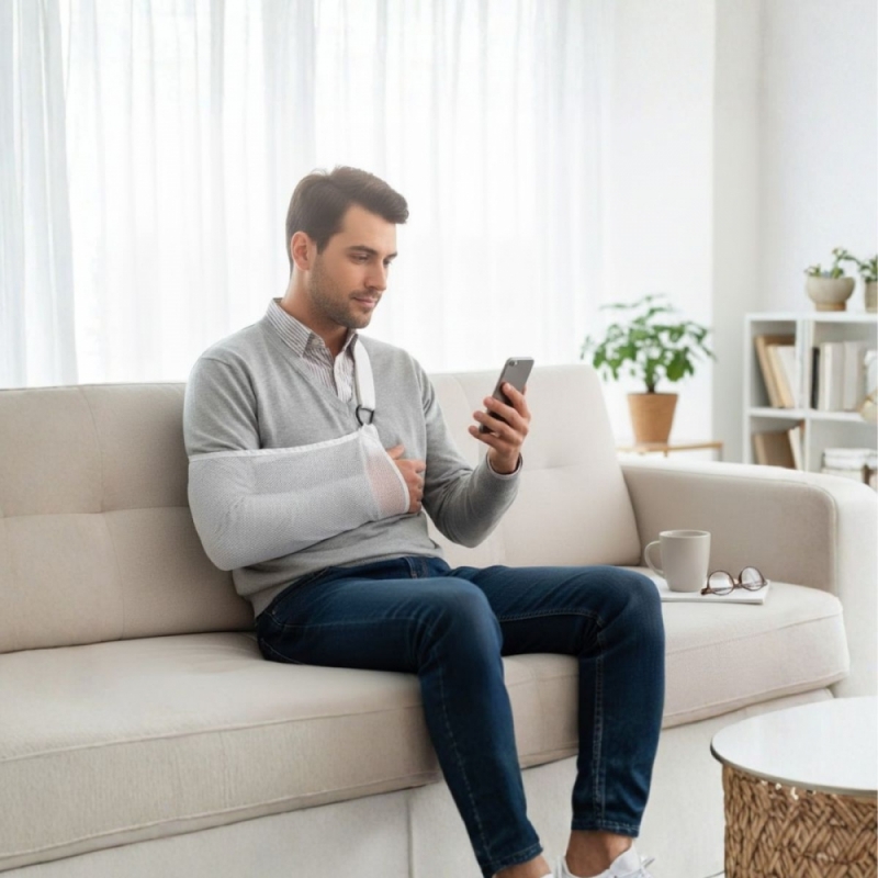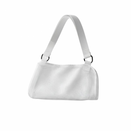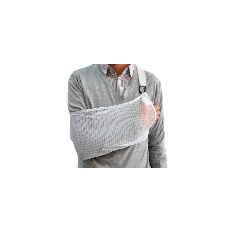 Sistema de sujeción, soporte e inmovilización del brazo y del hombro, mediante adaptación al cuello y tronco con sistema de cierre velcro que permite la regulación de la altura y la anchura.
