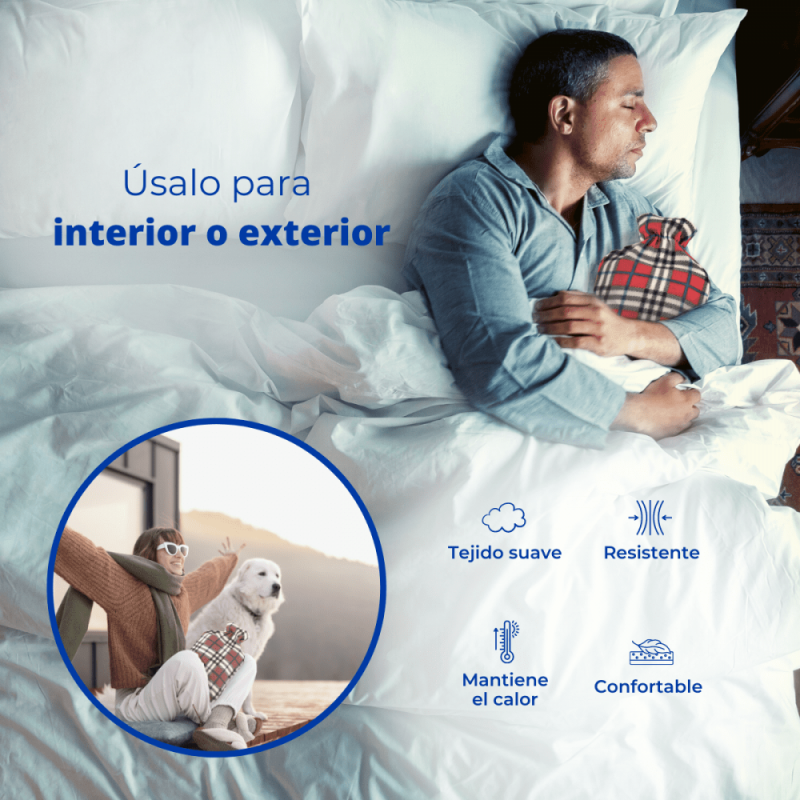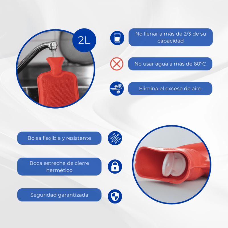 A la hora de elegir una bolsa de agua es importante la seguridad de la persona, por ello, esta bolsa de agua cuenta con un forro para evitar posibles quemaduras por el contacto directo con la parte más caliente de la bolsa.
