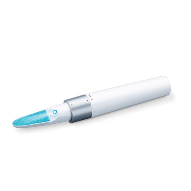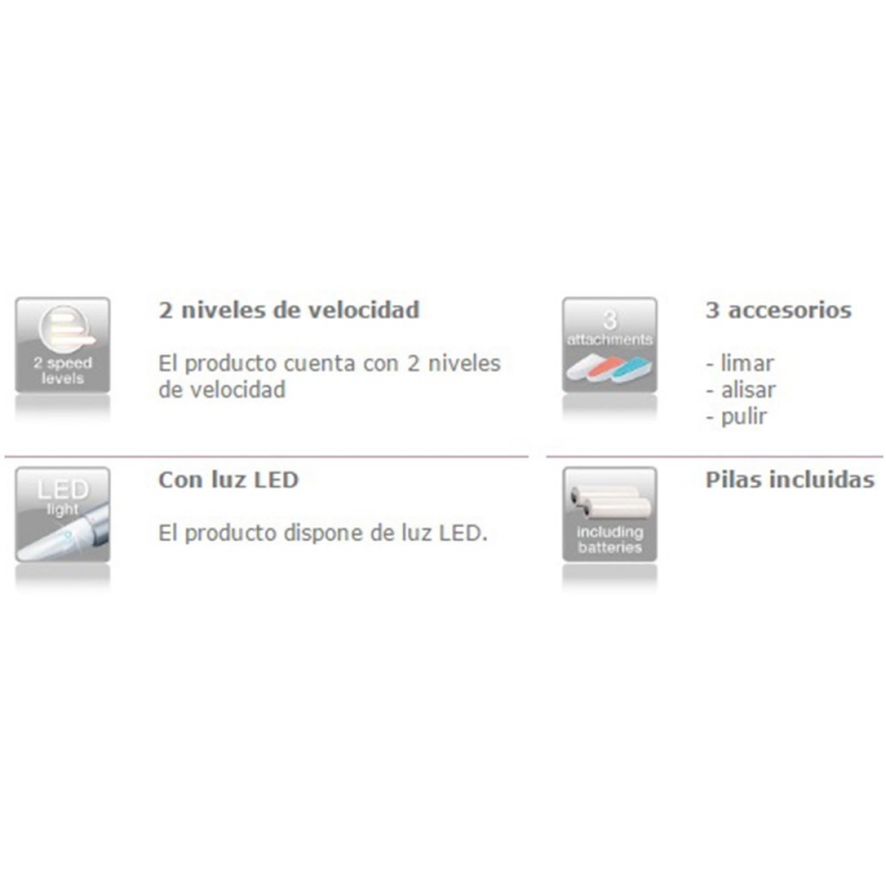 - Para el tratamiento de las uñas. - 3 accesorios incluidos: lima, lima suave y pulidor. - Con luz LED brillante. - 2 velocidades. - Indicador de encendido/apagado. - Bloqueo de seguridad. - Pila (1xAA) incluida. - (An-Al-Pr): 2.3 x 16.7 x 2.3 cm. - Peso: 250 gr.