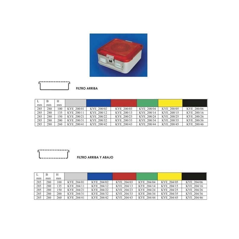 Contenedor plata para esterilización, con filtro arriba y abajo. Disponible la tapa en varios colores.