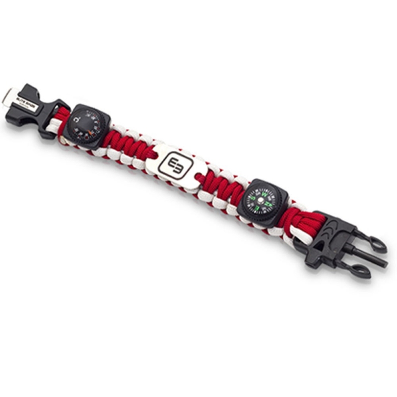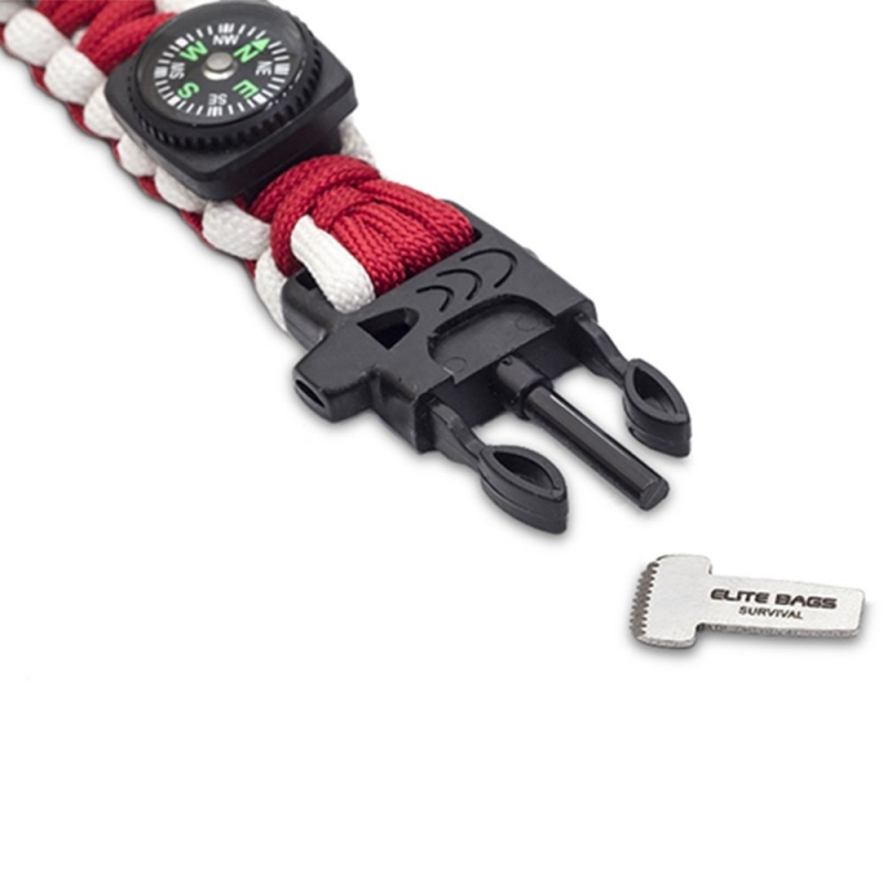 WRISTS Brazalete de supervivencia fluorescente rojo y blanco, 550 Pachute Cord Este brazalete está diseñado para contener de forma práctica, funcional y ligera, todos los elementos indispensables en caso de supervivencia.Fabricado con cordón de paracaídas, cuenta con un sin fin de aplicaciones de emergencias, ya que es extremadamente útil para la construcción de refugios, trampas para cazar animales, amarrar objetos, anclar tiendas de campaña, etc Además, extrayendo sus siete hilos internos, pueden ser utilizados para coser y suturar heridas. Dentro de sus componentes adicionales cuenta con: brújula, termómetro, sierra dentada y pedernal para hacer fuego, silbato, cuerda de rescate que brilla en la oscuridad y una placa metálica para emitir destellos de luz y facilitar la ubicación del usuario o rescatista. Características Brújula Termómetro Sierra dentada y pedernal para hacer fuego Silbato Cuerda de rescate que brilla en la oscuridad Una placa metálica para emitir destellos de luz y facilitar la ubicación del usuario o rescatista
