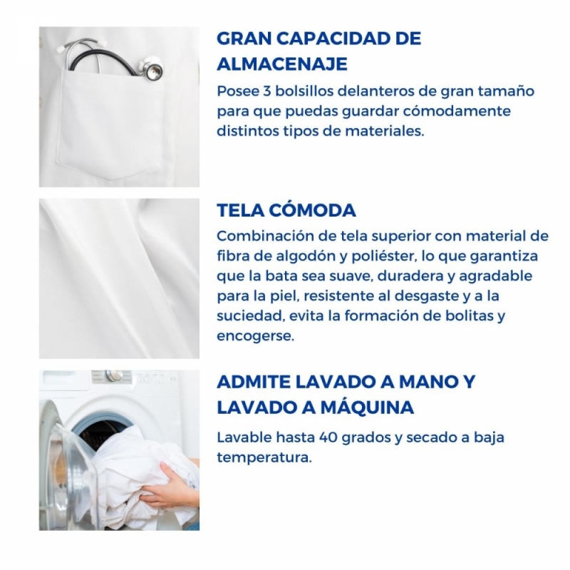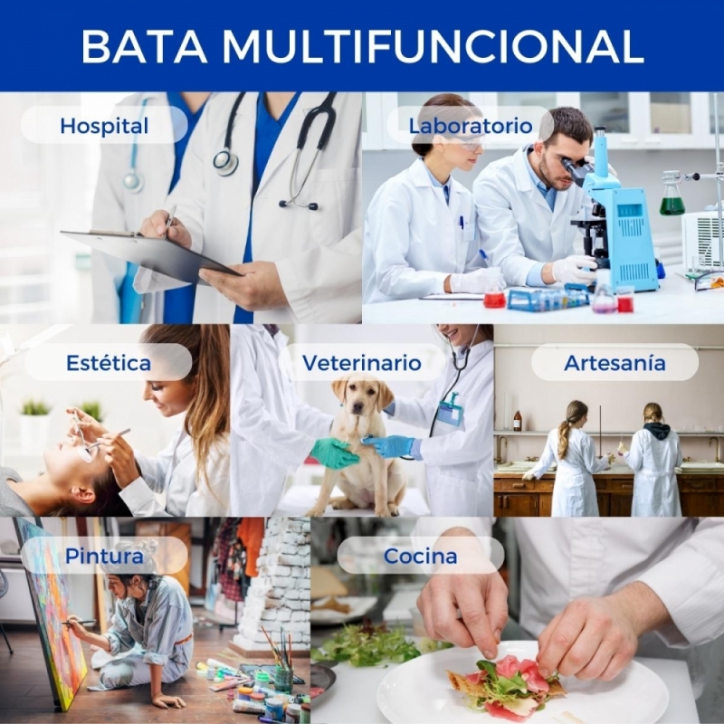 Gracias a su disponibilidad tanto para hombre como para mujer en hasta seis tallas diferentes, se trata de una bata completamente multifuncional, ya que puede ser empleada por médicos, enfermeros, farmacéuticos, veterinarios, esteticistas o en laboratorios. Incluso, es una prenda cómoda cuyo uso puede trasladarse a la cocina u otras actividades artísticas.