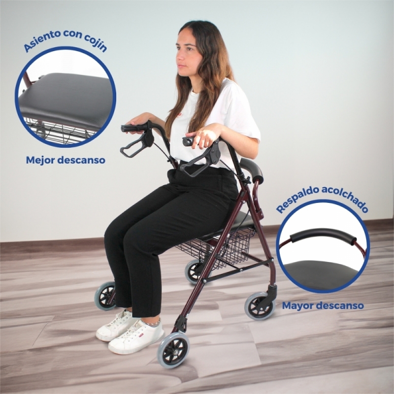 Este andador aluminio cuenta con un asiento y un respaldo acolchado para garantizar el confort y la seguridad, así como un descanso adecuado después del esfuerzo. Incluye una cesta pensada para guardar las pertenencias de manera segura y cómoda mientras caminas. Puedes posicionarla tanto debajo del asiento como en la parte delantera del andador.