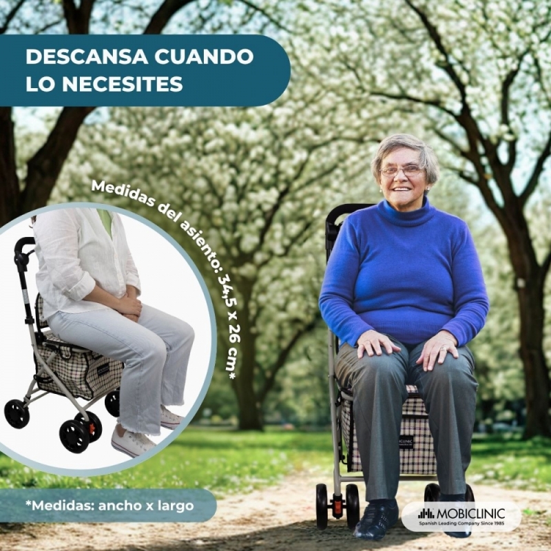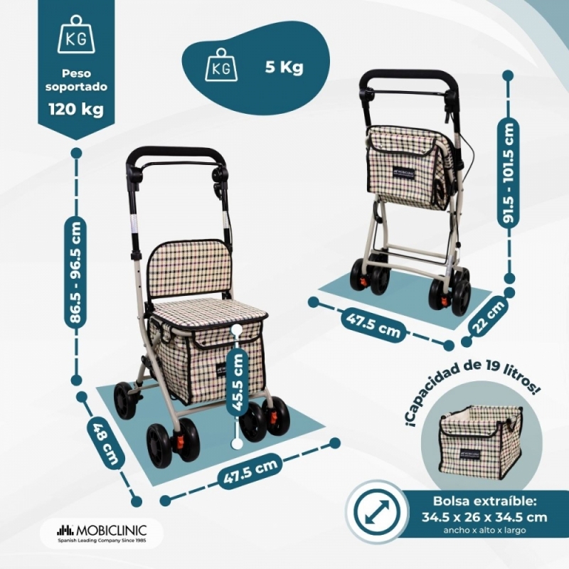 Carro de la compra andador | 4 ruedas | Hasta 120Kg | Plegable | Con bolsa | Sistema de frenado | Cuadros | Coliseo | Mobiclinic