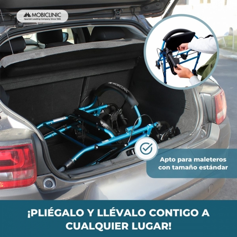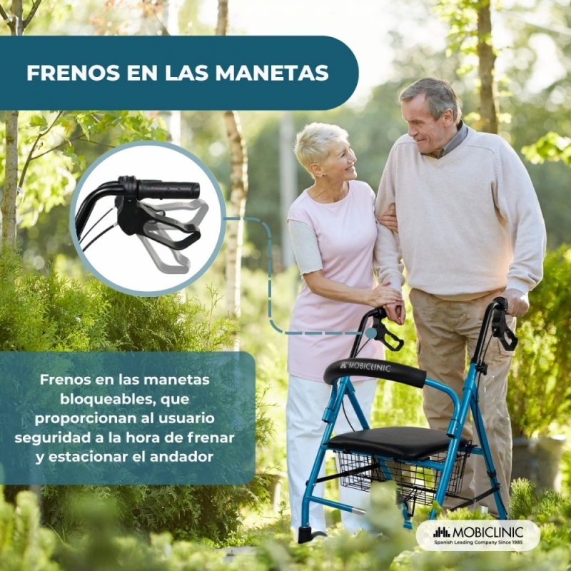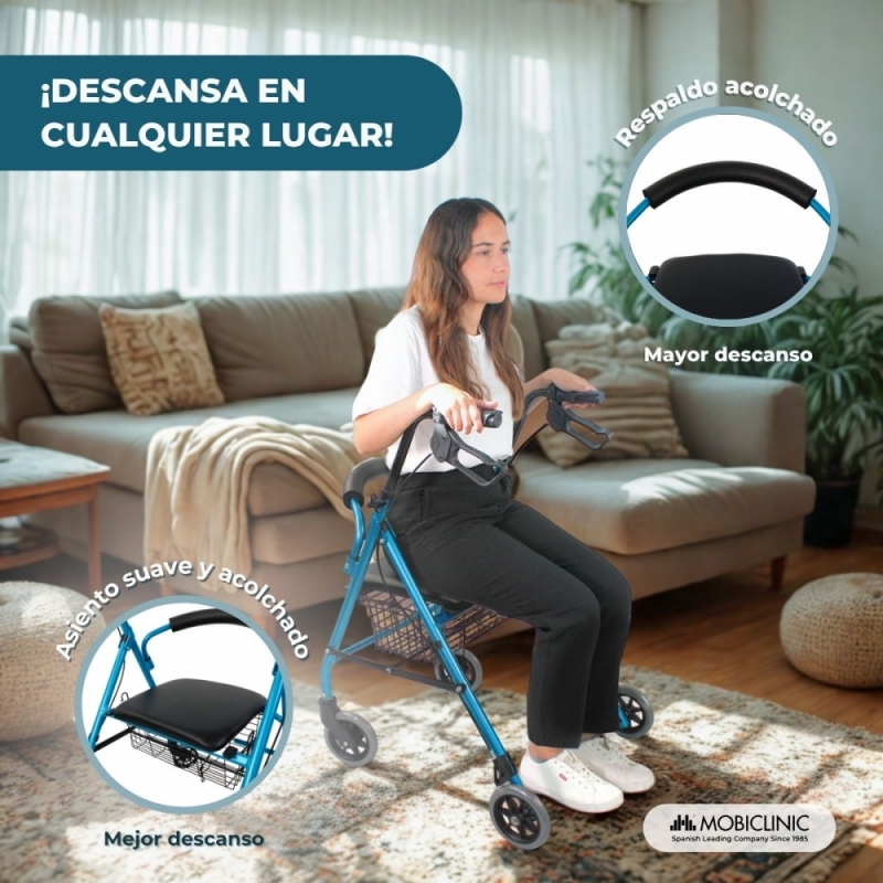 Andador | Plegable | Aluminio | Frenos en manetas | Asiento y respaldo | 4 ruedas | Azul | Escorial | Mobiclinic