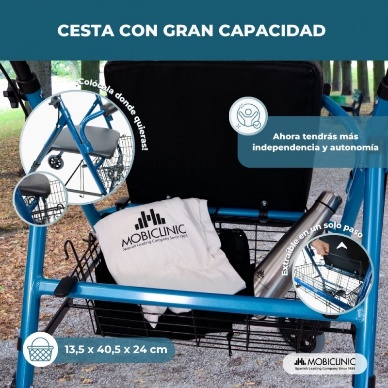 ÚTIL: este andador con asiento incluye una práctica cesta debajo del mismo para facilitar tareas como hacer la compra o transportar objetos.