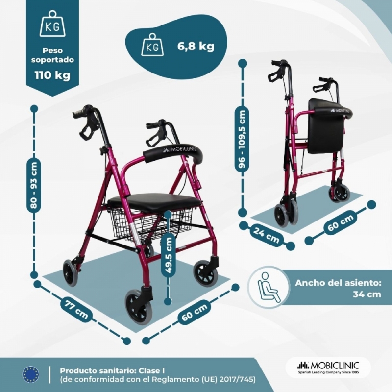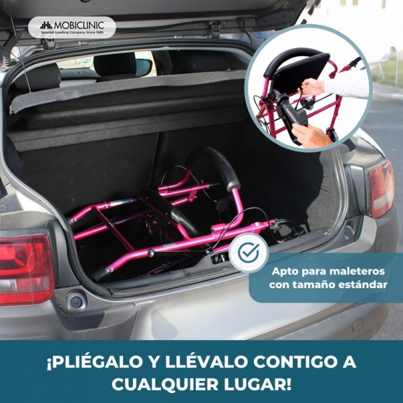 Andador | Plegable | Aluminio | Frenos en manetas | Asiento y respaldo | 4 ruedas | Rosa | Escorial | Mobiclinic