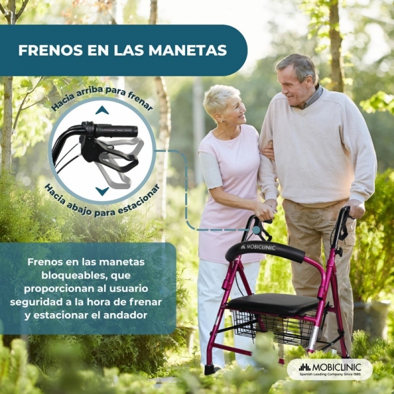 Las empuñaduras del andador con asiento son ergonómicas ayudando a repartir y amortiguar el peso y reduciendo el cansancio durante su uso. Además, incluyen unos frenos de activación suave para detener el andador justo en el momento deseado y sin esfuerzo, también ofrece la posibilidad de dejarlos bloqueados para garantizar la inmovilización del andador, por ejemplo, al sentarte en el asiento. Si se necesita inmovilizar por completo el andador, hay que tirar de las manetas de los frenos hacia abajo y las ruedas quedarán bloqueadas.