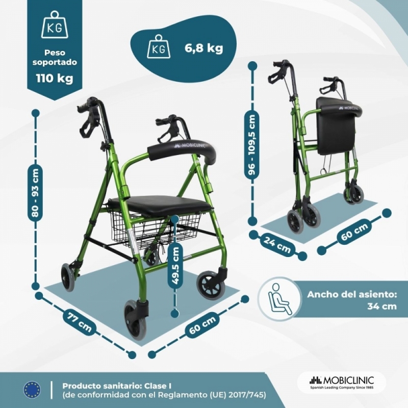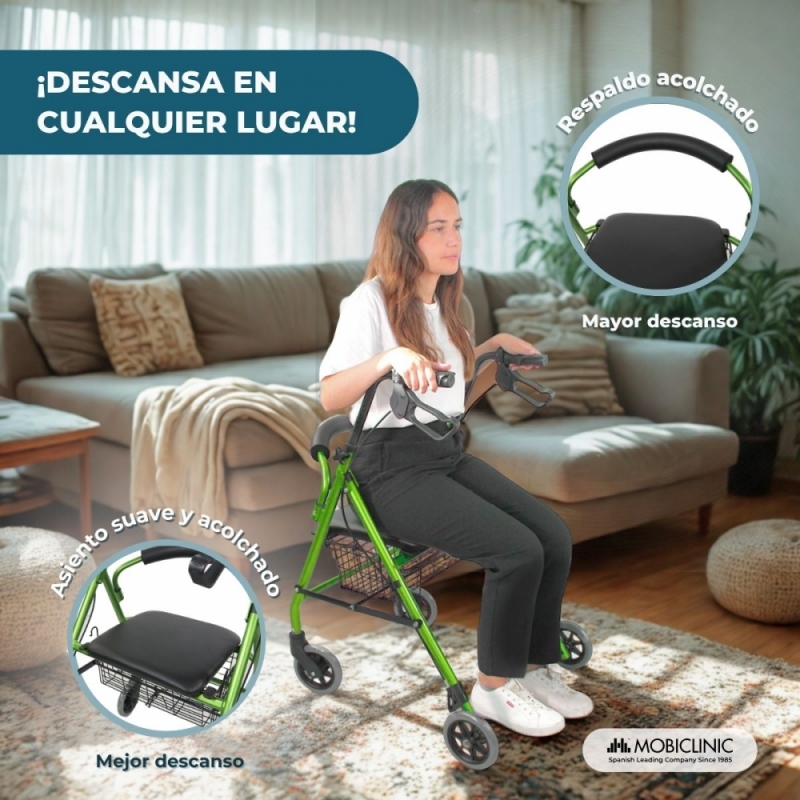 Andador | Plegable | Aluminio | Frenos en manetas | Asiento y respaldo | 4 ruedas | Verde | Escorial | Mobiclinic