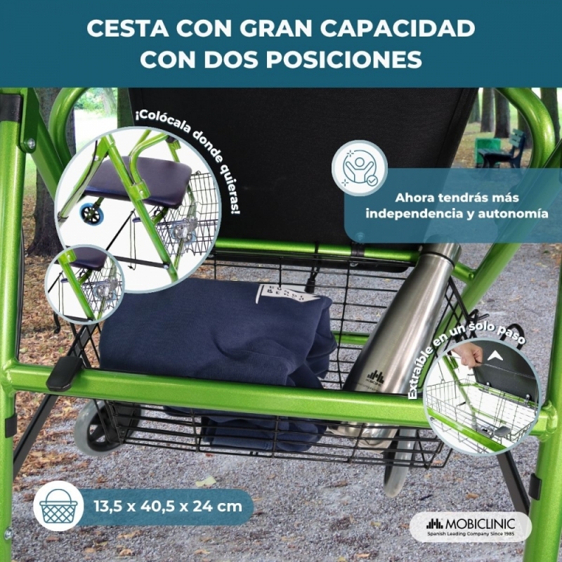 ÚTIL: este andador con asiento incluye una práctica cesta debajo del mismo para facilitar tareas como hacer la compra o transportar objetos.