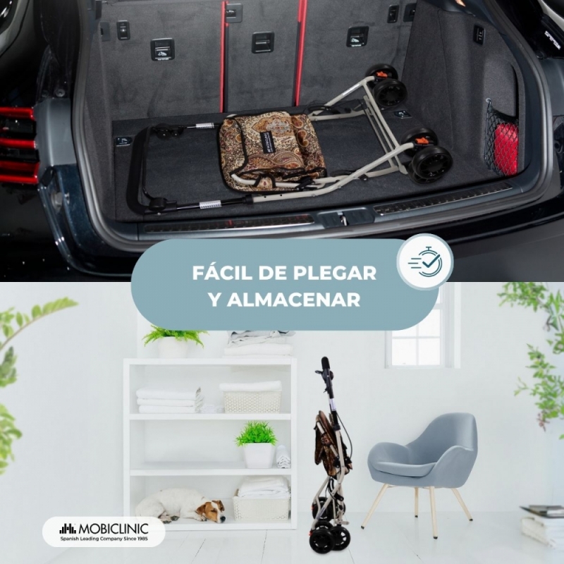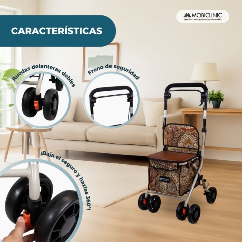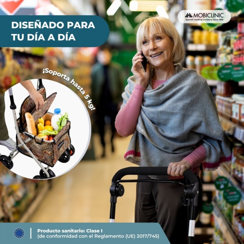 Carro de la compra andador | 4 ruedas | Hasta 120Kg | Plegable | Bolsa | Sistema de frenado | Estampado | Coliseo | Mobiclinic