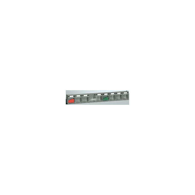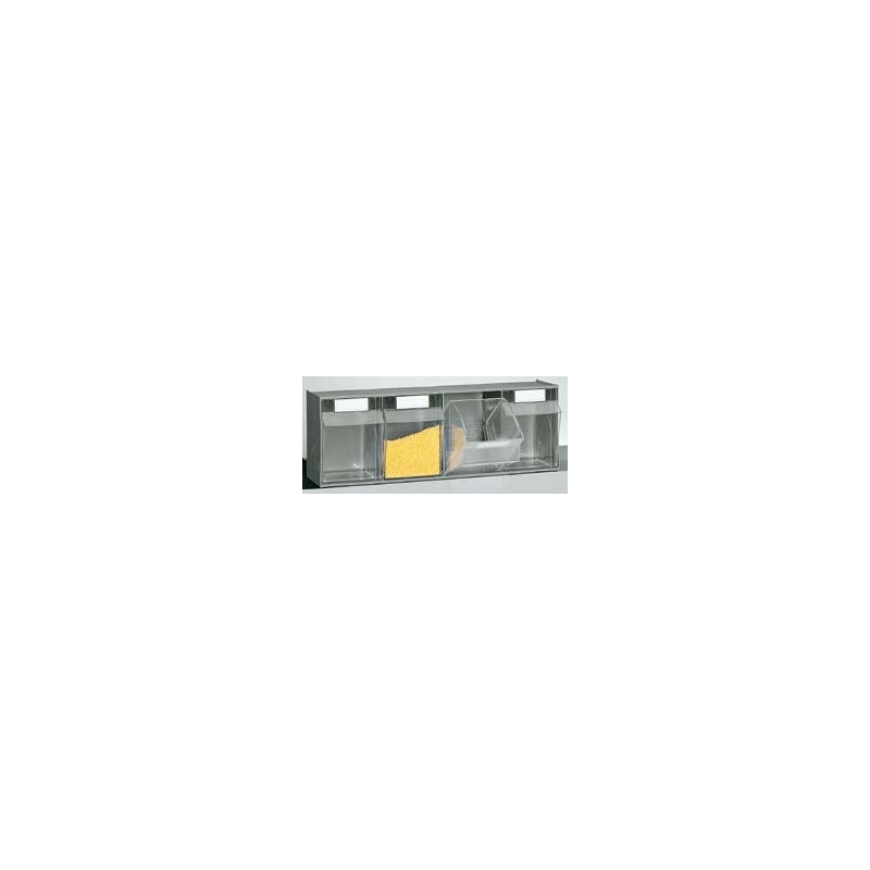 Sistema que consta de un armazón dividido en compartimentos, en cada uno de los cuales se aloja un cajón basculante de plástico transparente. Están disponibles modelos con diversas profundidades y alturas, pero siempre de 600 mm de ancho, por lo que se pueden superponer módulos de diferentes alturas, formando numerosas combinaciones. Se pueden fijar a la pared mediante tornillos o colocar en distintos tipos de soportes, expositores o carros gracias a unos perfiles verticales que actúan como guías. Le sirve el soporte de pared con refencia QM-00081/01.