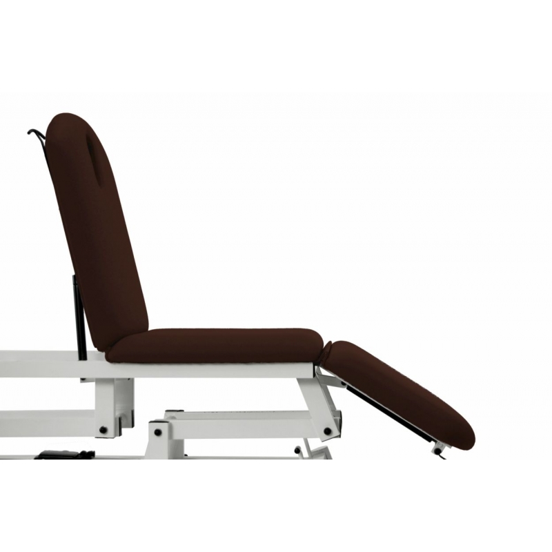 Camilla eléctrica tipo sillón de 3 secciones con portarrollos, tapón facial y ruedas escamoteables.