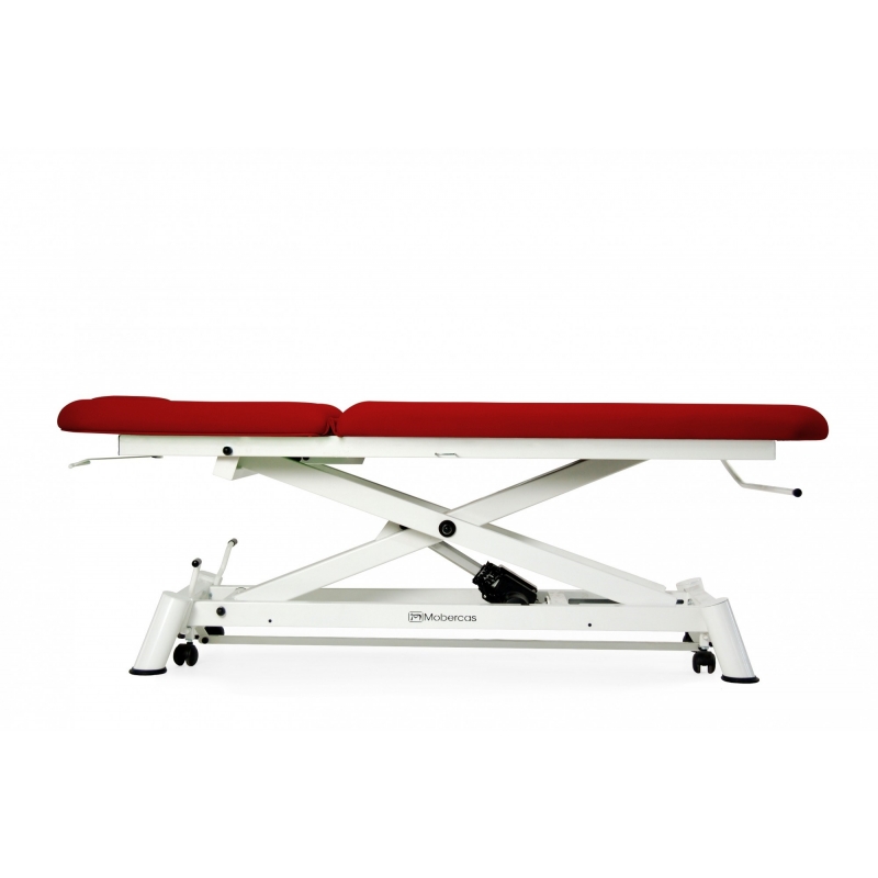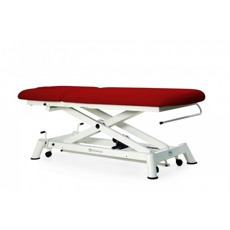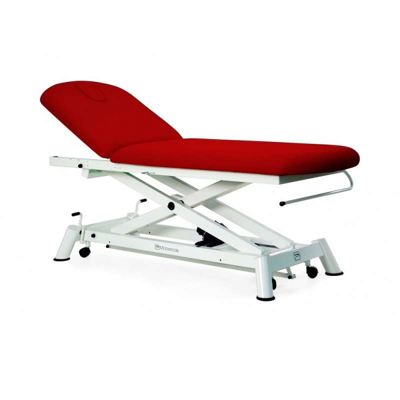 Camilla de reconocimiento eléctrica de 2 secciones con subida recta sin desplazamiento lateral, portarrollos, tapón facial y ruedas escamoteables.