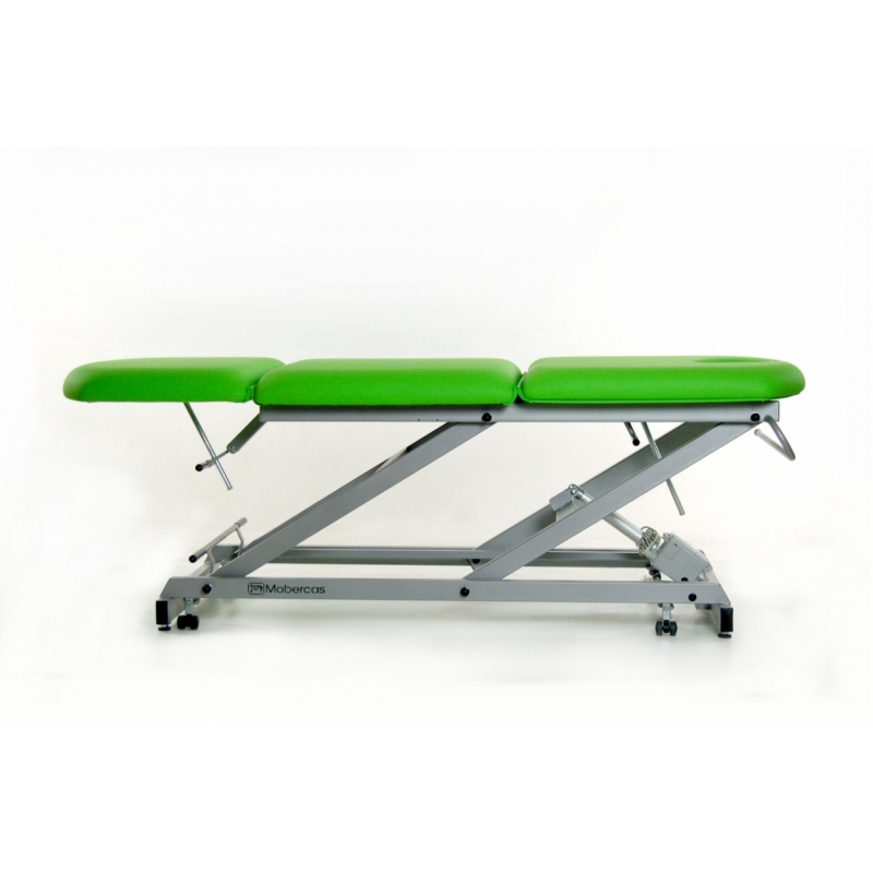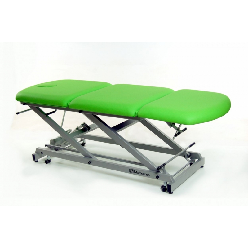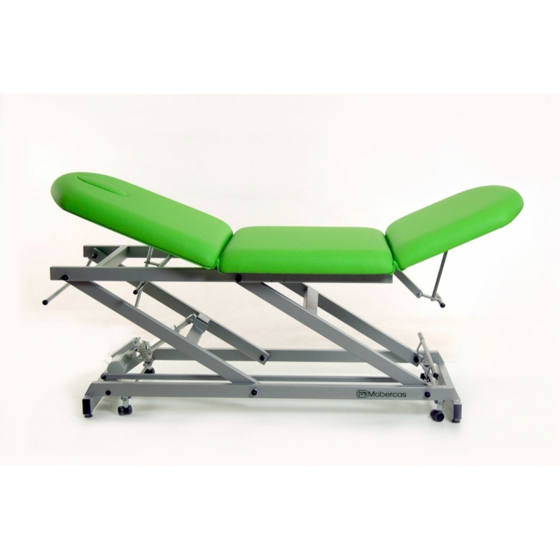 Camilla eléctrica tipo sillón de 3 secciones con portarrollos, tapón facial y ruedas escamoteables.