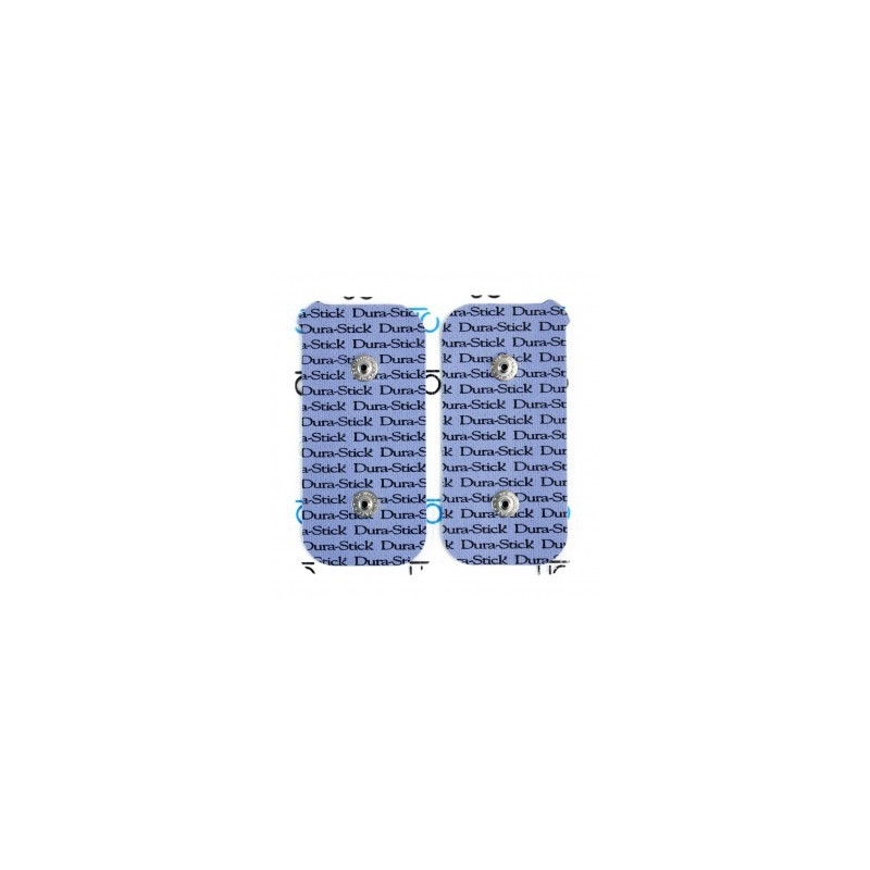 Electrodos Durastick de 5 x 10 cm indicados para electroestimuladores Compex de 2 SNAP. El envase contiene 2 unidades (2 electrodos). Son ideales de usar gracias a la tecnología Easy SnapTM permiten la conexión entre el cable y el electrodo con una sola mano ejercienco presión sobre los mismos.