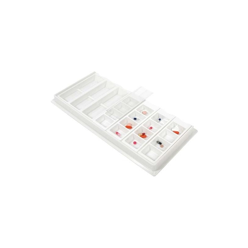 Bandeja de medicación semanal para carro de medicación (Ref. QM-00108/01), fabricada en polímero resistente y fácilmente lavable y esterilizable. Cada bandeja posee 7 pastilleros con 4 cavidades cada uno, para la medicación de las distintas tomas. Tiene tapa transparente y pestaña para rotular nombres.