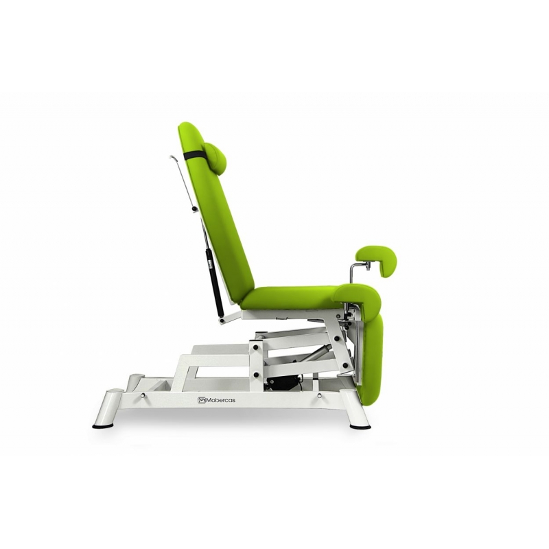 Sillón de reconocimiento ginecológico eléctrico con regulación de altura mediante mando de mano.