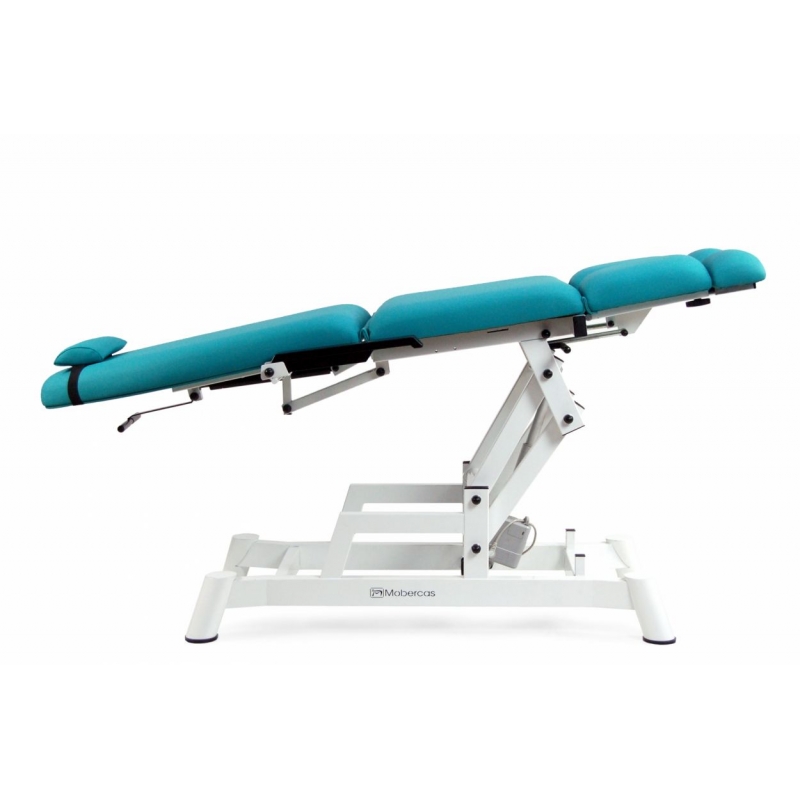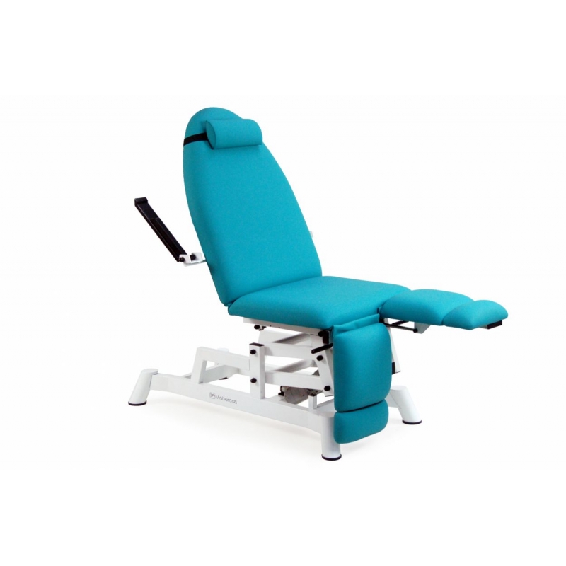 Sillón de podología eléctrico con regulación de altura mediante mando de mano. Incluye apoyabrazos abatible 90º (metálicos y tapizados), perneras independientes y extensibles y cojín cervical ergonómico.