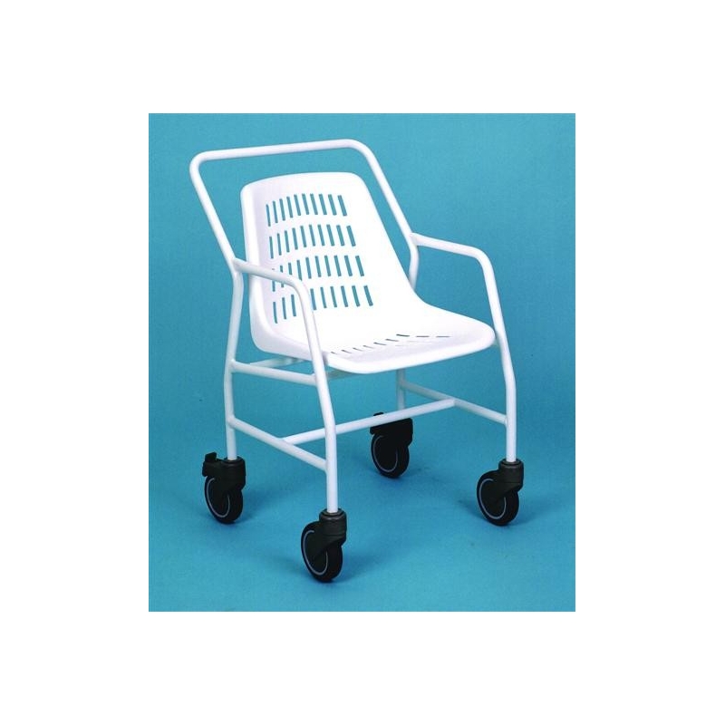 Se trata de una práctica silla multiusos, fabricada en aluminio, muy resistente, ligera y totalmente inoxidable. La silla incorpora cuatro ruedas de 12.5 cm de diámetro, con frenos incluidos en las dos ruedas traseras.