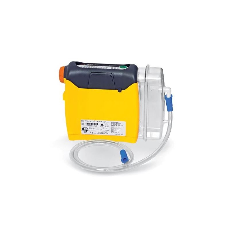 Aspirador de secreciones extremadamente compacto, destinado a la eliminación de fluidos de las vías respiratorias o del sistema apoyo respiratorio. El aspirador crea una depresión que extrae los fluidos a través del catéter desechable conectado al recipiente colector. Esta versión viene completa con fuente de alimentación.