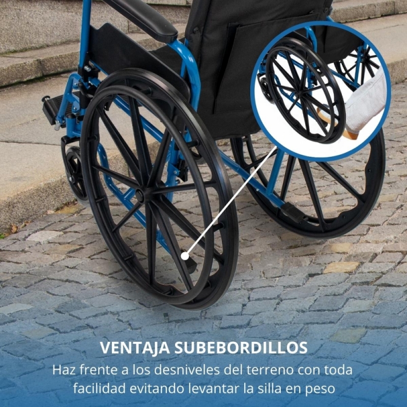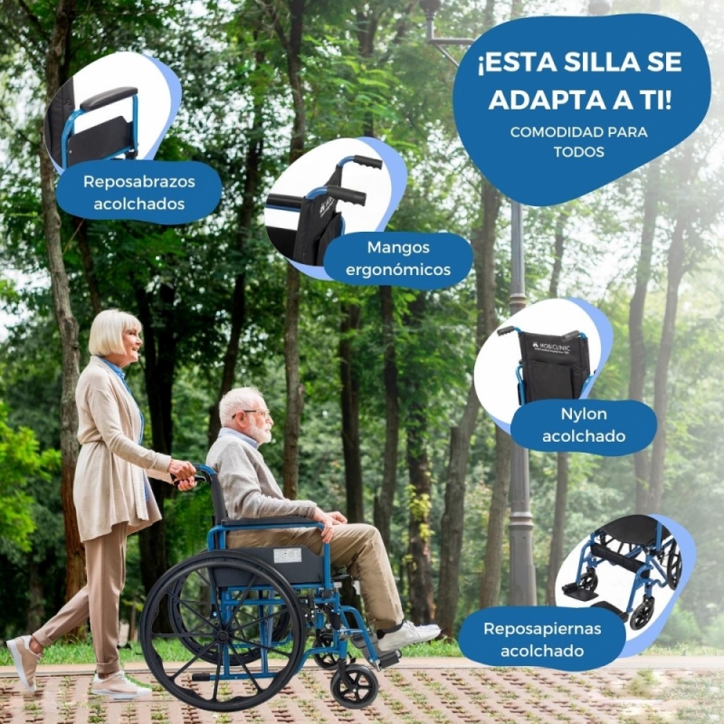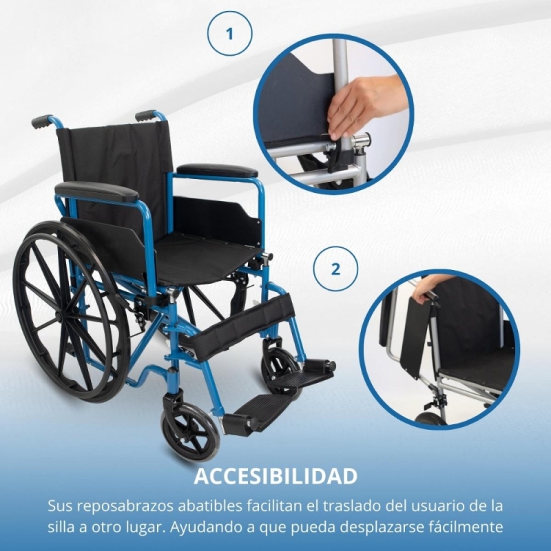 - Diseño: La silla de ruedas autopropulsable tiene un elegante diseño, con estructura en color azul y tapicería de Nylón acolchado. Tiene un bolsillo en el respaldo para llevar cosas personales.