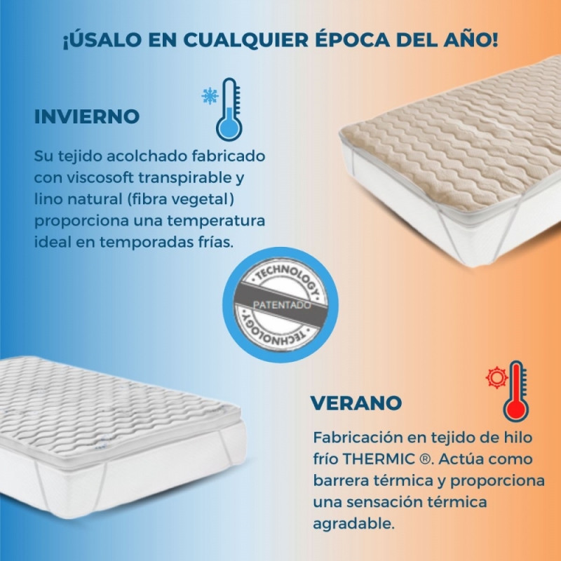 TERMOREGULABLE: Contiene microcápsulas que almacenan y reciclan el calor, si es demasiado elevado lo absorben y se almacena el calor excedente. El tejido de la cara de verano es de hilo frío y actúa como barrera térmica. El tejido de la cara de invierno es de lino natural y proporciona una temperatura ideal en temporadas frías. Absorbe la humedad y es transpirable. Todo esto, es un proceso repetitivo e infinito, no descansa, por lo que se consigue una regulación térmica con ausencia de frío o calor.