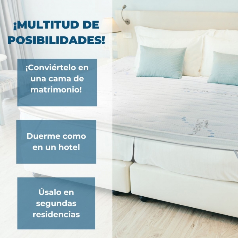 ¡Dale a tu colchón el toque que le falta! Con este topper colchoncito podrás darle una oportunidad a tu colchón ya sea porque esté demasiado duro, sin perder firmeza (gracias a las fibras naturales) o demasiado blando, ganando confortabilidad. Sigue disfrutando de tu colchón en segundas viviendas, en tu vivienda de alquiler o para camas de casas vacacionales. También se puede usar el topper para ganar confort en el sofá cama o para unir dos colchones y obtener una cama más grande por ejemplo, para un cuarto de invitados.