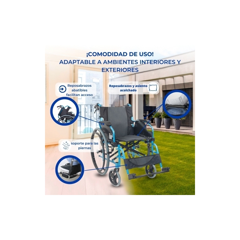 Además, tiene reposapiés desmontables, para una mayor seguridad del usuario y reposabrazos abatibles acolchados, lo que mejora el confort, facilita la transferencia del paciente y evita posibles úlceras por el roce, convirtiéndola en la mejor opción de sillas de ruedas plegables y ligeras.