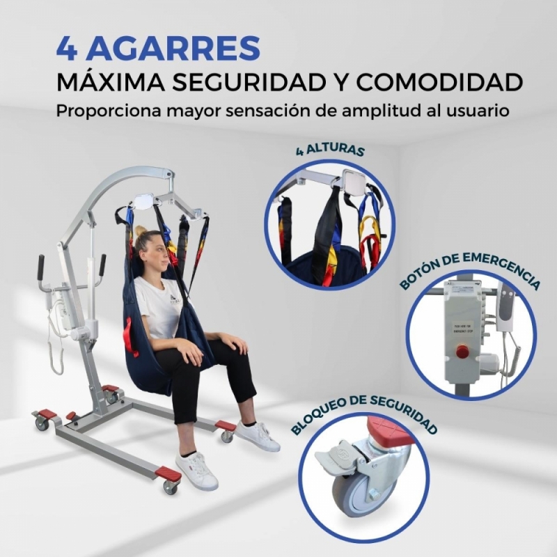 MAYOR SEGURIDAD: Disminuye el riesgo de lesiones o caídas tanto del paciente como del cuidador. Dispone de una percha que permite que el usuario se pueda sujetar durante los traslados para garantizar su estabilidad y, a su vez, contiene un botón de parada de emergencia pudiendo bajar o subir al paciente manualmente si fuese necesario.
