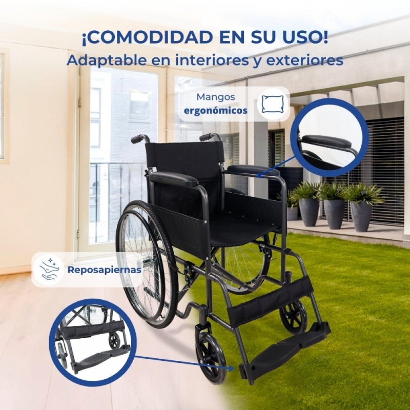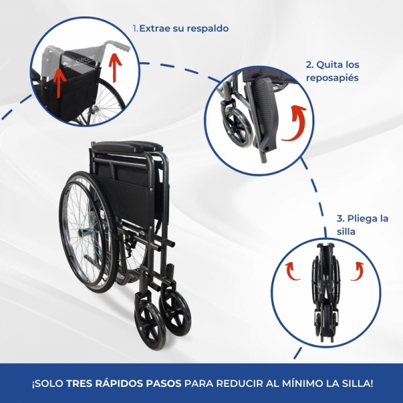 PLEGABLE: silla de ruedas plegable fácil de guardar. Se pliega para facilitar el transporte.