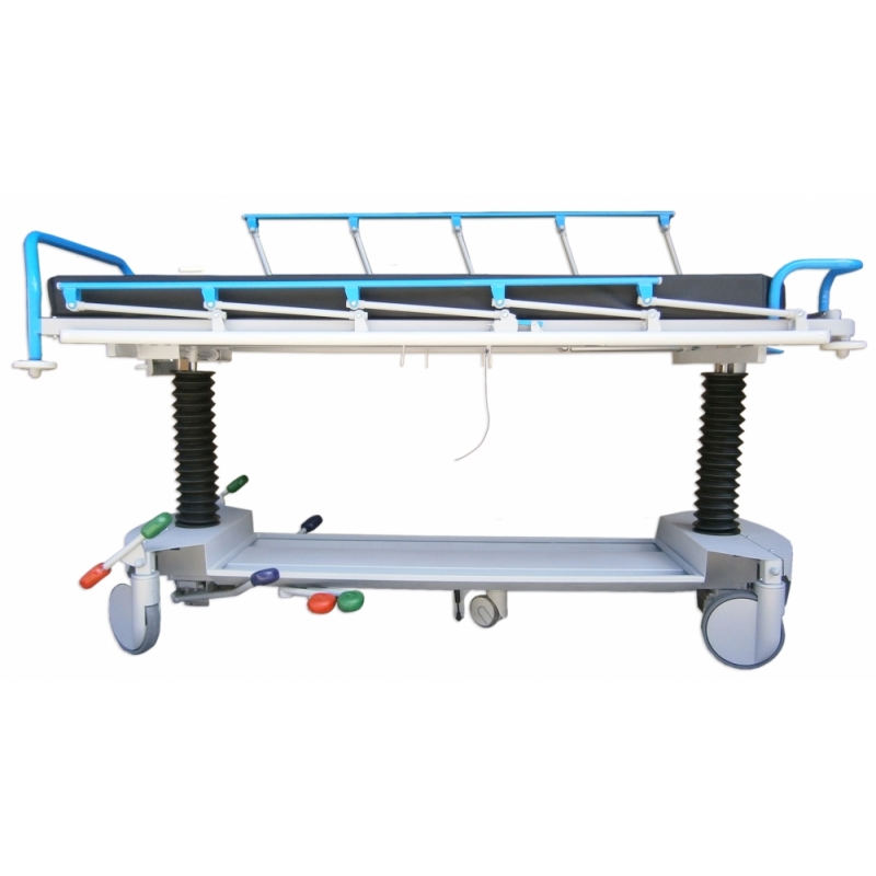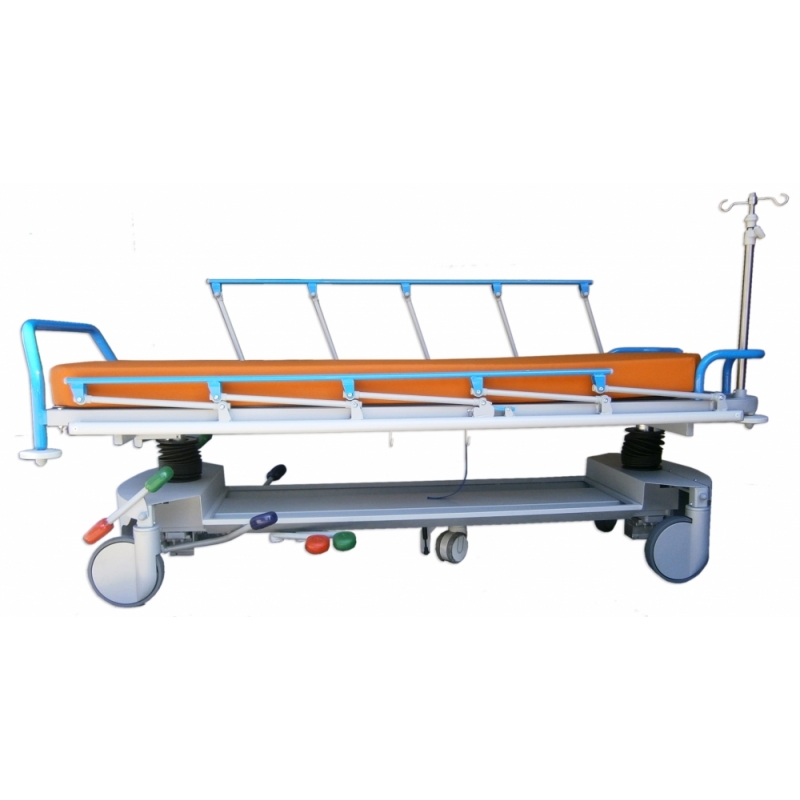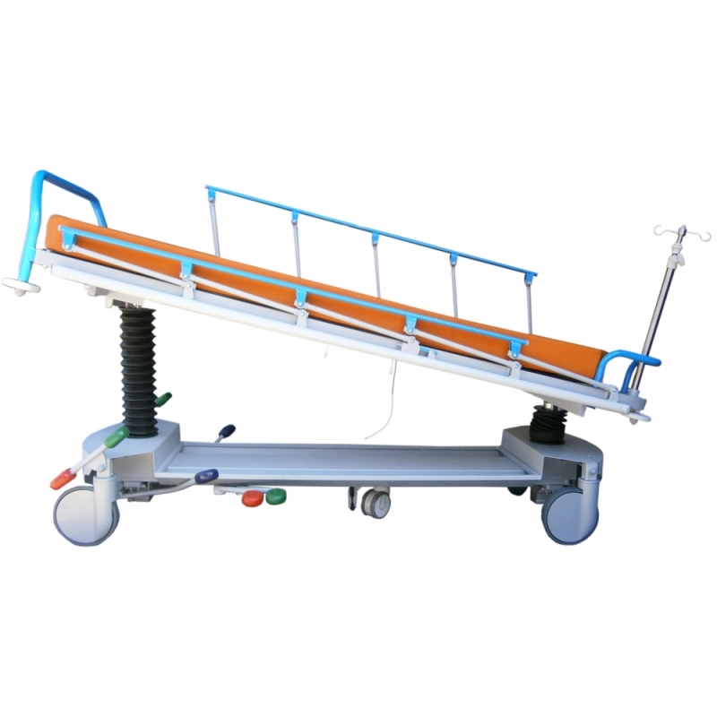 CARACTERISTICAS TECNICAS: Para transporte, acomodo, diagnóstico y/o tratamiento de pacientes, procedimientos y críticos. Estructura de gran robustez, estabilidad y durabilidad en acero pintado al horno en EPOXIPOLIESTER, color estándar gris metalizado aluminio RAL 9006. Lecho 2 cuerpos de material compacto fenólico (HPL) radiotransparente de 6 mm., con colchoneta alta densidad de 10 cm. para larga estancia, tapizada desmontable con velcro. Máximo área en plano y vertical para radiodiagnóstico por Rayos X y Arco en C. Paso inferior para grúas. Respaldo y/o pies (fowler) abatible con movimiento asistido de doble cilindro de gas hidroneumático en palancas manuales. Elevación en altura, con Tren y Antitren mediante 2 columnas hidráulicas (carga combinada estática 1.600 Kg., dinámica 900 Kg.), carenadas mediante fuelles de caucho de fácil limpieza, maniobras accionadas por 3 pedales bilaterales. Barandillas bilaterales plegables con enclave automático de seguridad y protección anti choque. Rodadura con 4 ruedas de 200 mm., carenado plástico, con freno total simultáneo centralizado y rueda servo direccional, accionado a ambos lados de camilla, con sistema de quinta rueda conductiva de 125 mm. con amortiguación. Conexión equipotencial. Asideros de empuje en cabecera ergonómicos, 4 roldanas paragolpes y bandas anti rozaduras laterales. Carriles bilaterales y longitudinales para cinchado de paciente. Base con carenado metálico de fácil limpieza, con portaobjetos y porta botella múltiples de oxígeno. 2 pares de ganchos de drenajes bilaterales. Porta sueros de 2 ganchos, de acero inoxidable telescópico y escamoteable por abatimiento en cabecera. Piecero de empuje y maniobra, extraíble y desmontable. Tapizado técnico vinílico (PVC / Poliester, 650 gr/m2.) con resistencia a la abrasión, transpiración, saliva, sangre, orina, luz UV, aceites y manchas. Resistencia a altas y bajas temperaturas. Protección antimicrobiana, antibacteriana y antimicótico. Ignífugo M2 y lavable. Impermeabilidad. Medidas totales: ancho 81cm x Largo 207 x Alto 78cm