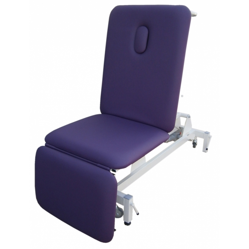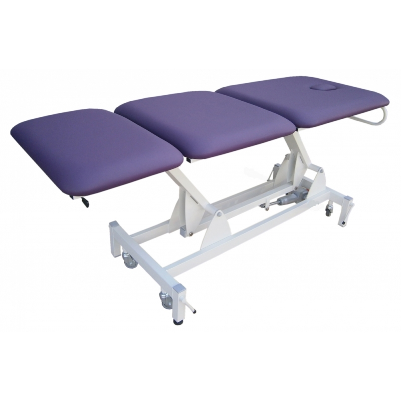 CAMILLA DE TRATAMIENTO, EXPLORACION Y MASAJE, REF. MM-ECOMAX-3H: TRES SECCIONES, ELEVACION EN ALTURA HIDRAULICA, RESPALDO Y PIE ABATIBLE MANUALMENTE POR CILINDROS DE GAS. SECCION CENTRAL FIJA ORIFICIO FACIAL Y TAPA. SISTEMA DE RUEDAS ACCIONADO EN AMBOS EJES ANCHURA 70 CM., BASE CON PASO DE GRUAS 13,5 CM. PORTAROLLOS DE PAPEL DE SERIE.