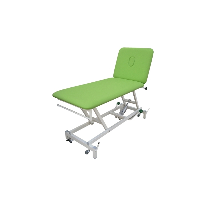 - Lecho de la camilla, de 2 cuerpos, puede elevarse desde 45 cm hasta 83 cm, con respaldo abatible por enclave con manetas de accionamiento a ambos lados de la camilla lo que permite al profesional una fácil adaptación a la terapia a realizar.