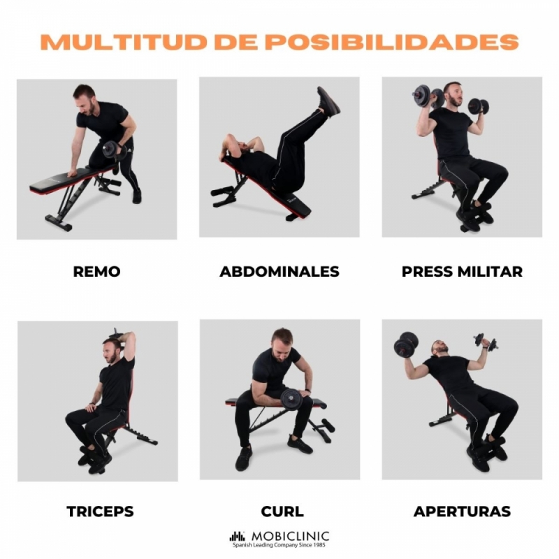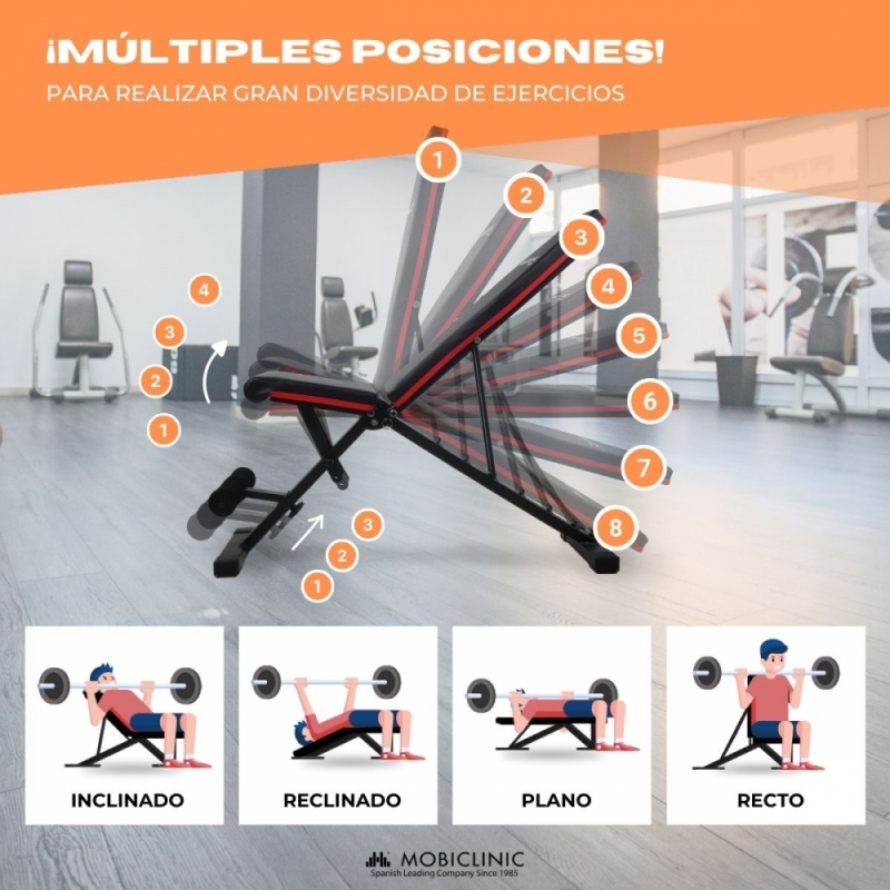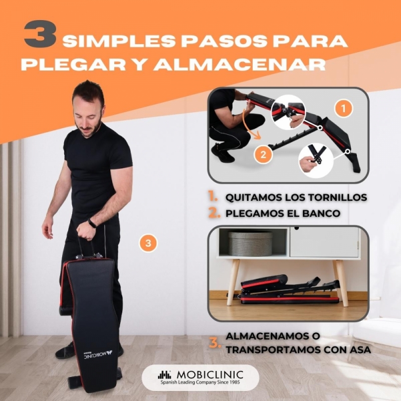 Banco de entrenamiento multifunción | Plegado ultra compacto | Max 200 kg | Regulable | Asa de transporte | FlexFit | Mobiclinic