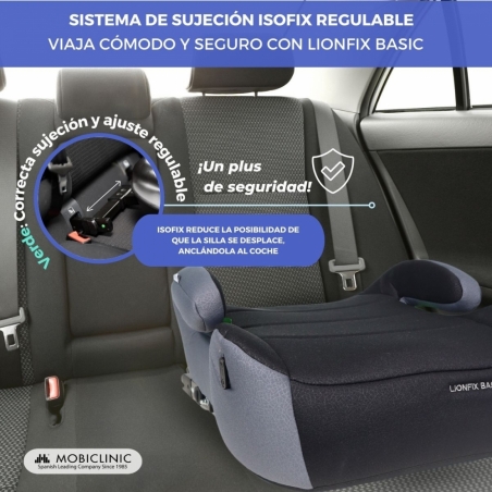 Alzador de coche infantil | i-Size | 125-150 cm | ISOFIX regulable | Desenfundable | Portabotellas | Lionfix Basic | Mobiclinic