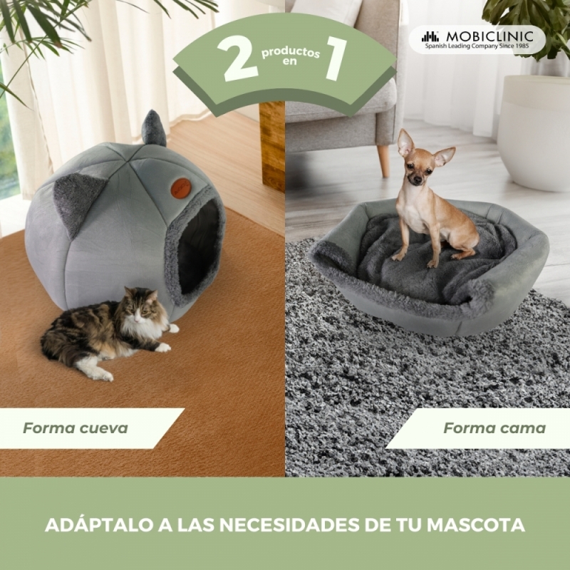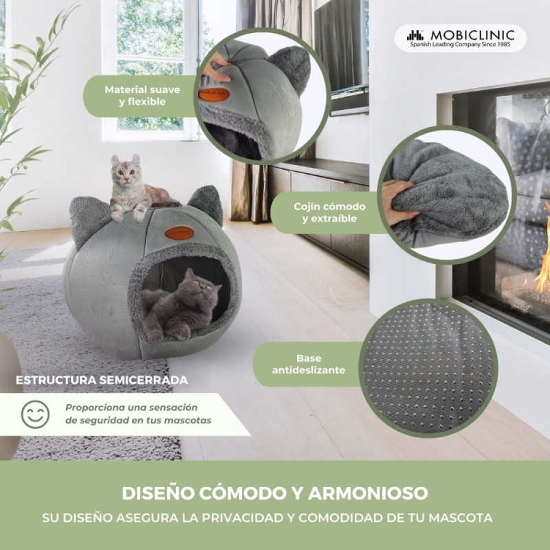 Cueva nido gris para mascotas | Plegable | Gris | Confort | Suave | 38x49x45 cm | Carga máx. 12Kg | HelloCatty | Mobiclinic