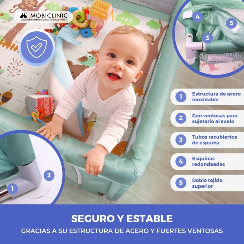 FIJACIÓN AL SUELO Y SEGURIDAD: Equipado con ventosas fuertes, se adhiere al suelo con máxima seguridad, evitando desplazamientos no deseados o que el corralito se pueda volcar. Las esquinas son redondeadas y los tubos están recubiertos de espuma.