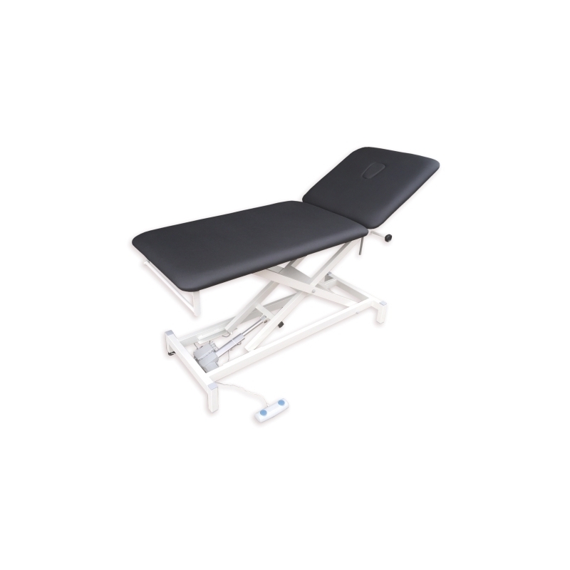 - Lecho de la camilla, de 2 cuerpos, puede elevarse desde 50 cm hasta 83 cm, con respaldo abatible por enclave con manetas de accionamiento a ambos lados de la camilla lo que permite al profesional una fácil adaptación a la terapia a realizar.