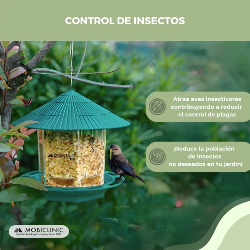 Adicionalmente, este comedero para pájaros silvestres contribuye al control natural de plagas al fomentar la presencia de aves. Ayuda a mantener el equilibrio ecológico al reducir de manera efectiva las poblaciones de insectos no deseados en el entorno.