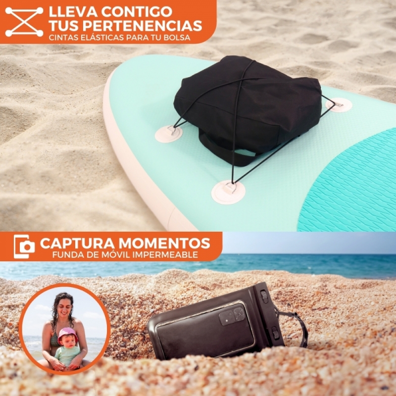EXPERIENCIA VERSÁTIL EN EL AGUA: Gracias a su excepcional estabilidad, el stand up paddle Lilo es perfecta para una variedad de actividades acuáticas, desde yoga y turismo costero hasta llevar a tus hijos o mascotas contigo. Además, su diseño robusto la hace ideal para la pesca tranquila o probar el surf en aguas más suaves. Con la funda acuática para el móvil incluida, podrás capturar momentos inolvidables, como fotografiar peces mientras haces snorkel.