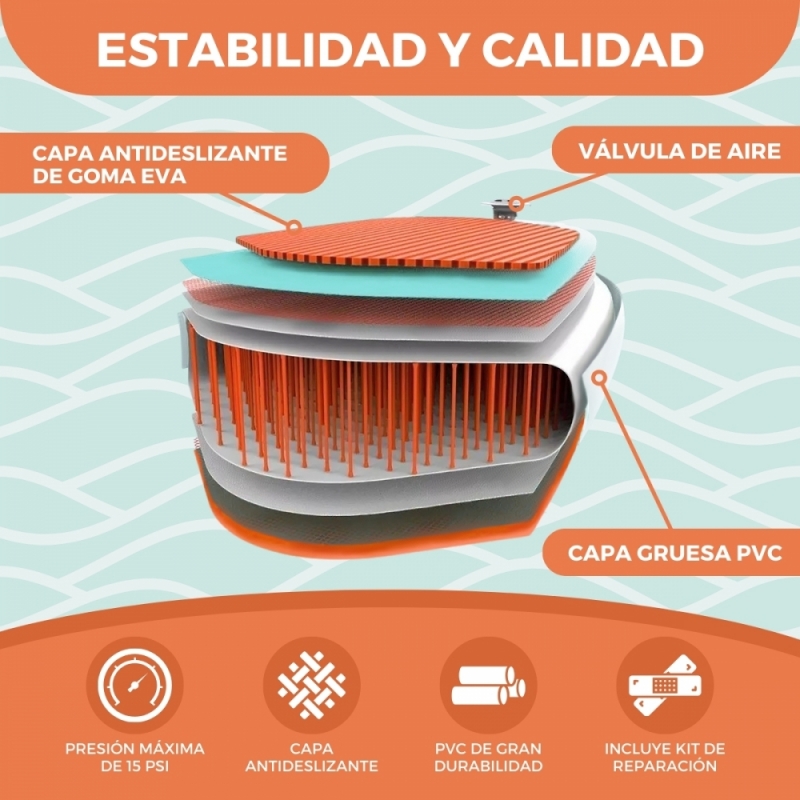 KIT COMPLETO: Nuestro exclusivo kit te ofrece todo lo necesario para sumergirte en la emocionante experiencia del paddle surf hinchable. Desde la tabla hasta los accesorios esenciales como la bomba con manómetro y el remo ajustable hemos reunido todo lo que necesitas para empezar tu aventura acuática de inmediato. Además incluye kit de reparación.