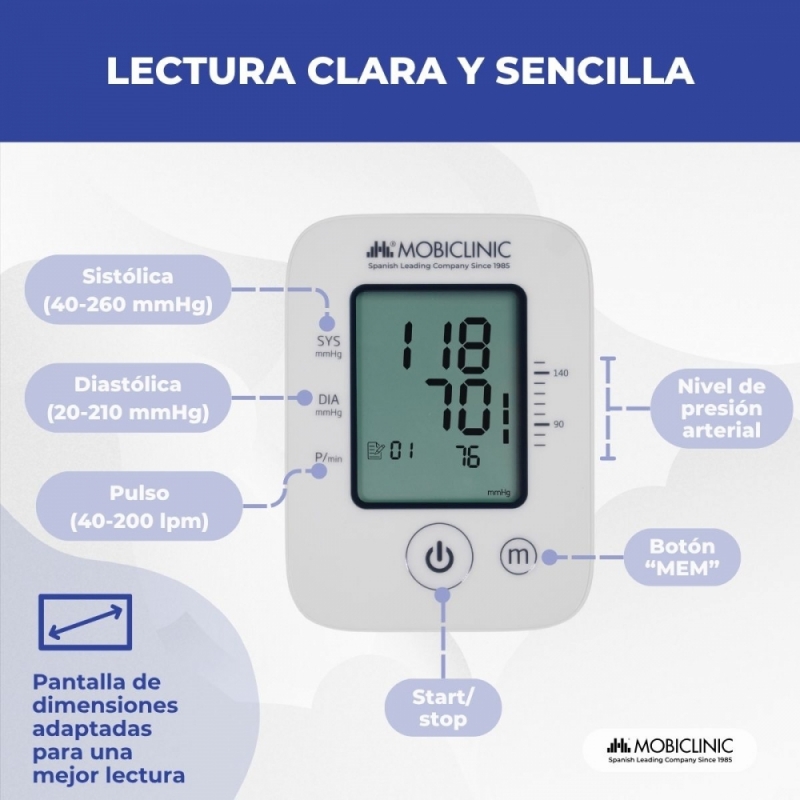 FÁCIL DE USAR: Funciona mediante un único botón central que lo convierte en un dispositivo intuitivo y accesible para cualquier usuario. Además, su base inclinada permite una mejor visibilidad de la pantalla LCD sin necesidad de levantar el dispositivo, facilitando aún más la lectura