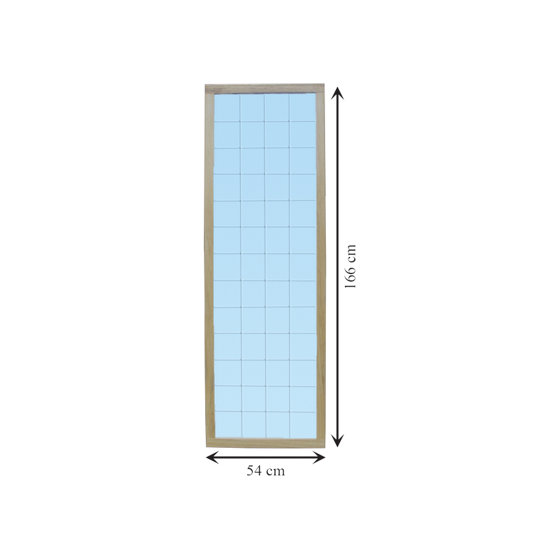 Marco fabricado en madera barnizado natural. Espejo de cristal con cuadriculas. Consta de : Espejo cuadriculado con marco Medidas: 166 cm de alto x 54 cm de ancho Lamina autoadhesiva pegada en la parte trasera del cristal que evita desprendimientos en caso de rotura. Medidas 166x54cm